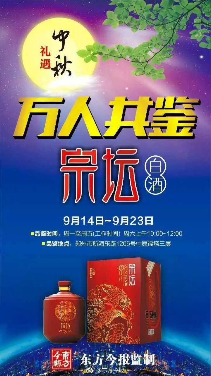 此次白酒品鉴活动由东方今报社承办,面向爱酒人士,懂酒的、爱酒的一起来吧,因酒结缘,以酒会友。也可加入QQ群:36926065,一起分享品酒心得。同时东方今报官方微博及公众号发起抽奖活动,参加即有机会获得宗坛酒一瓶。